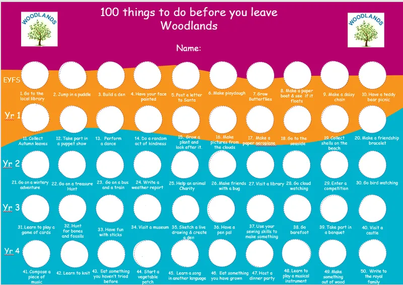The children have activities to complete before they leave Woodlands. Each year groups carefully plans these activities throughout the year and then they create a year group folder which is kept in the book areas in school.